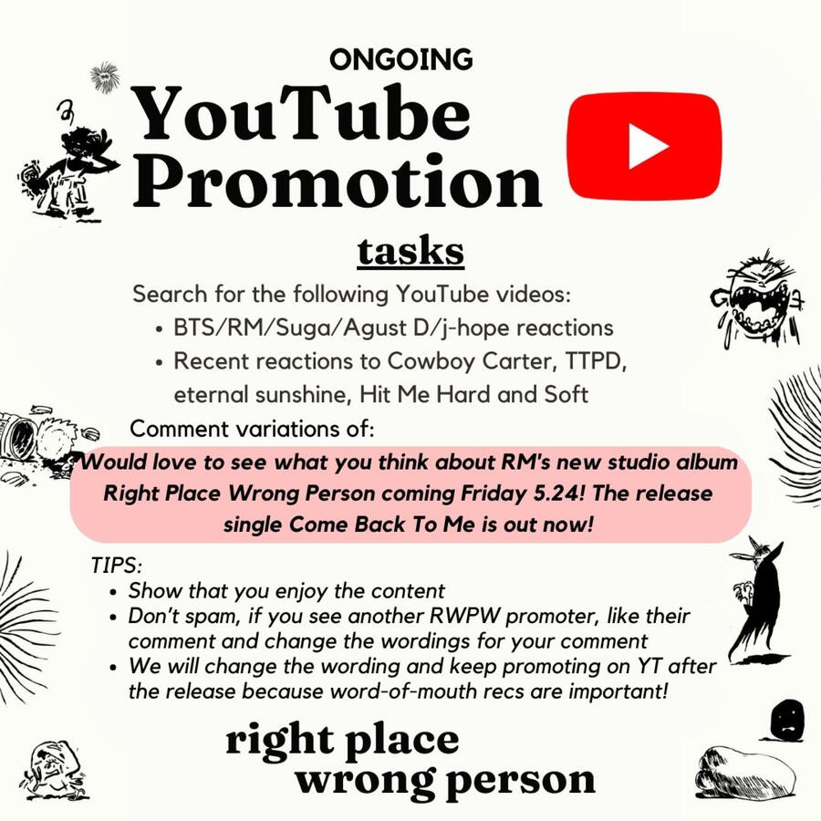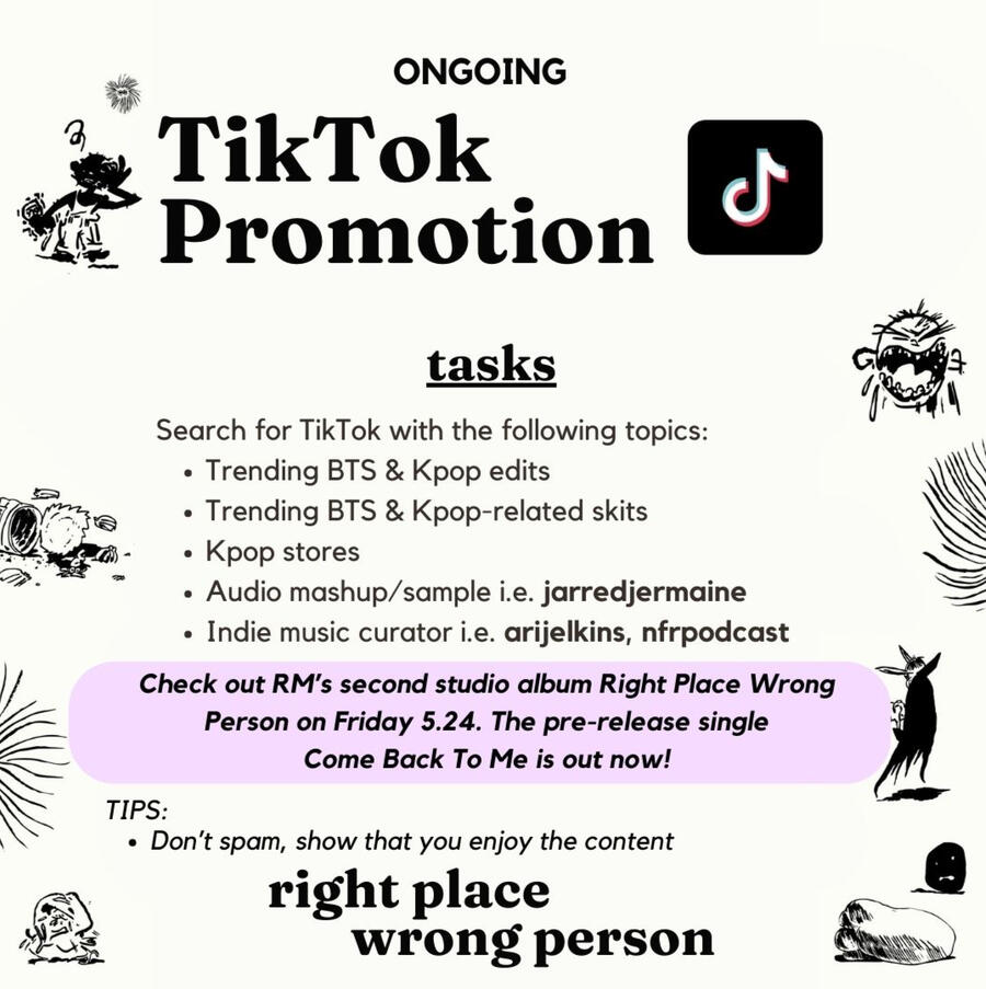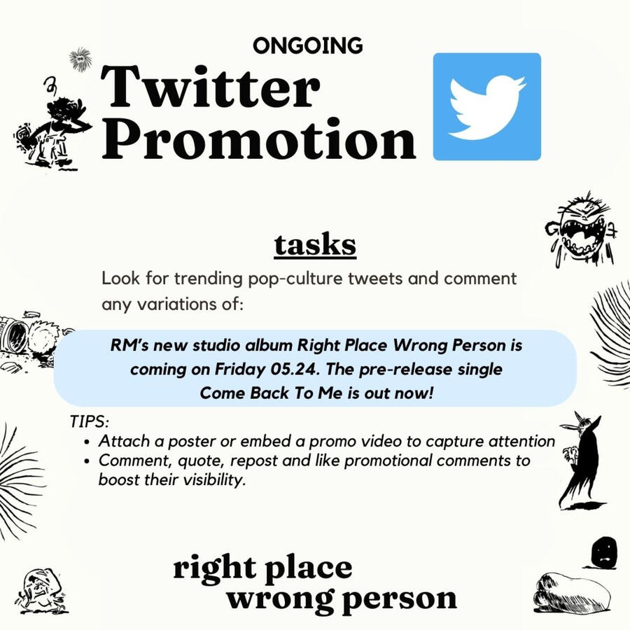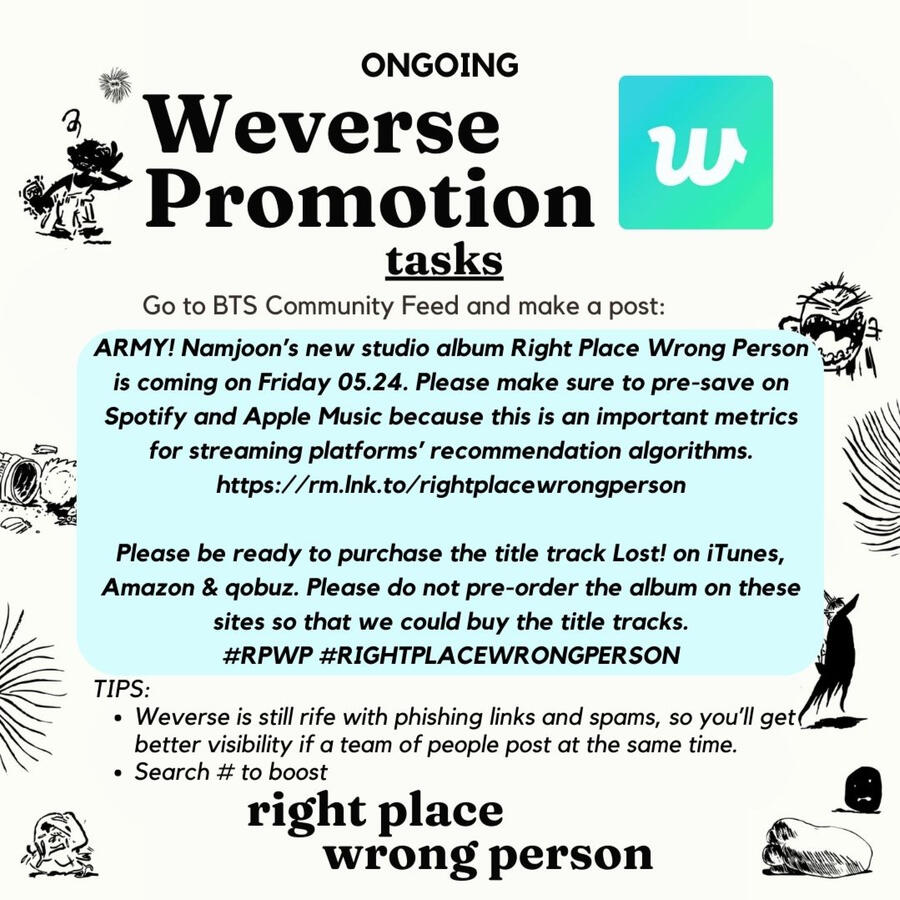 Attach promotional posters to capture attention.Use hashtags to look for promotional posts to boost.Template text:ARMY! Namjoon’s new studio album Right Place Wrong Person is coming on Friday 05.24. Please make sure to pre-save on Spotify and Apple Music because this is an important metrics for streaming platforms’ recommendation algorithms.https://rm.lnk.to/rightplacewrongpersonPlease be ready to purchase the title track Lost! on iTunes, Amazon & qobuz. Please do not pre-order the album on these sites so that we could buy the title tracks.#RPWP #RIGHTPLACEWRONGPERSON