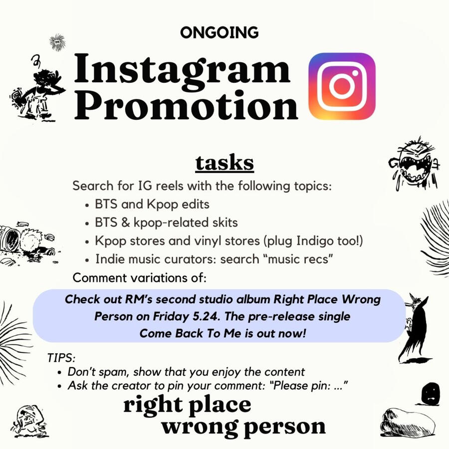 Leverage the audience of high-traffic posts.Template text:RM’s new studio album Right Place Wrong Person is coming on Friday 05.24. The pre-release single Come Back To Me is out now!